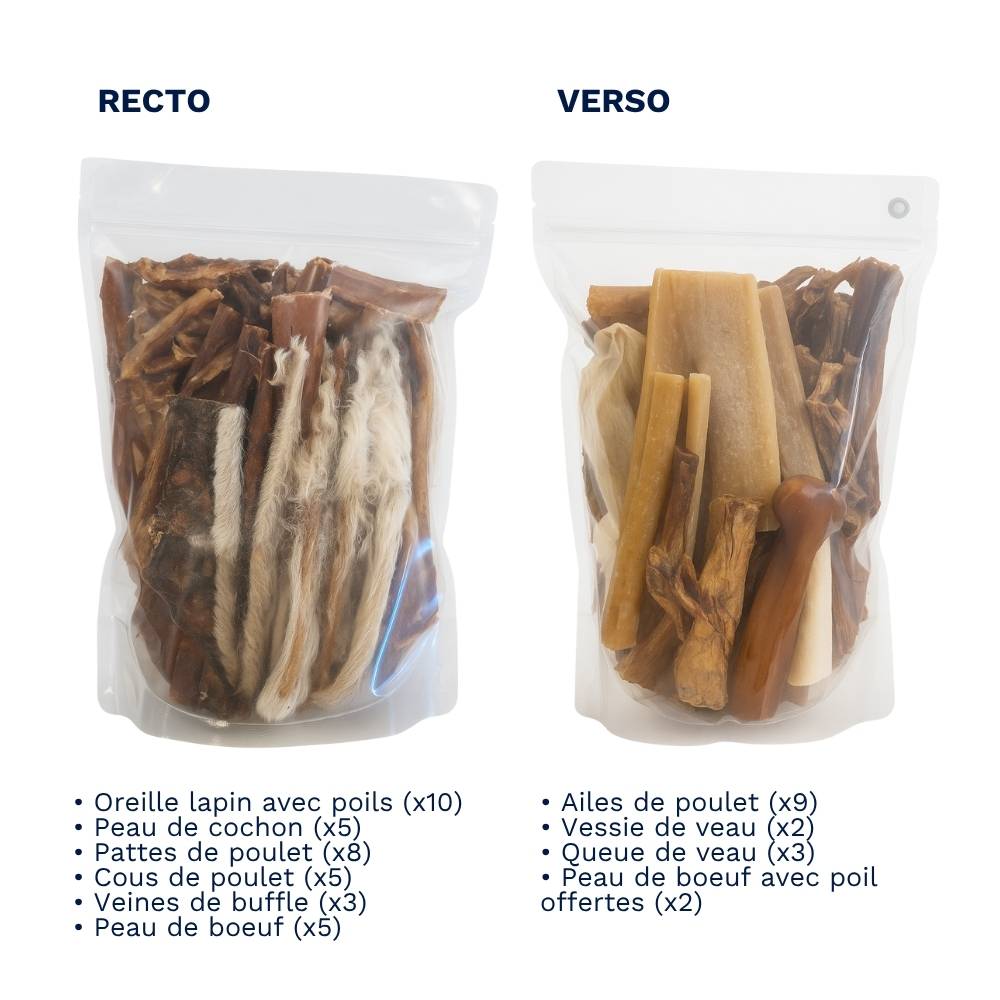 Offrez à votre chien une sélection variée de friandises naturelles, idéales pour le régaler tout en prenant soin de lui. Un pack généreux, parfait pour varier les plaisirs et satisfaire tous les profils de mâchouilleurs !
